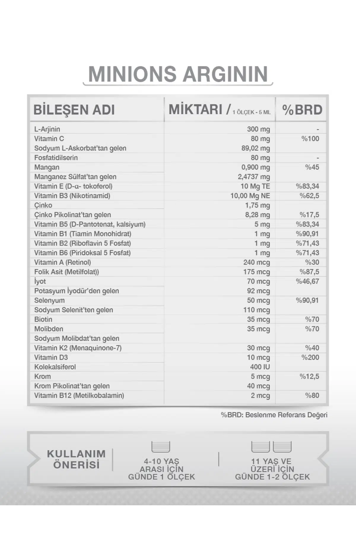 • - Minions Arjinin, çocukların günlük vitamin ihtiyacını karşılamak üzere özel olarak formüle edilmiştir.