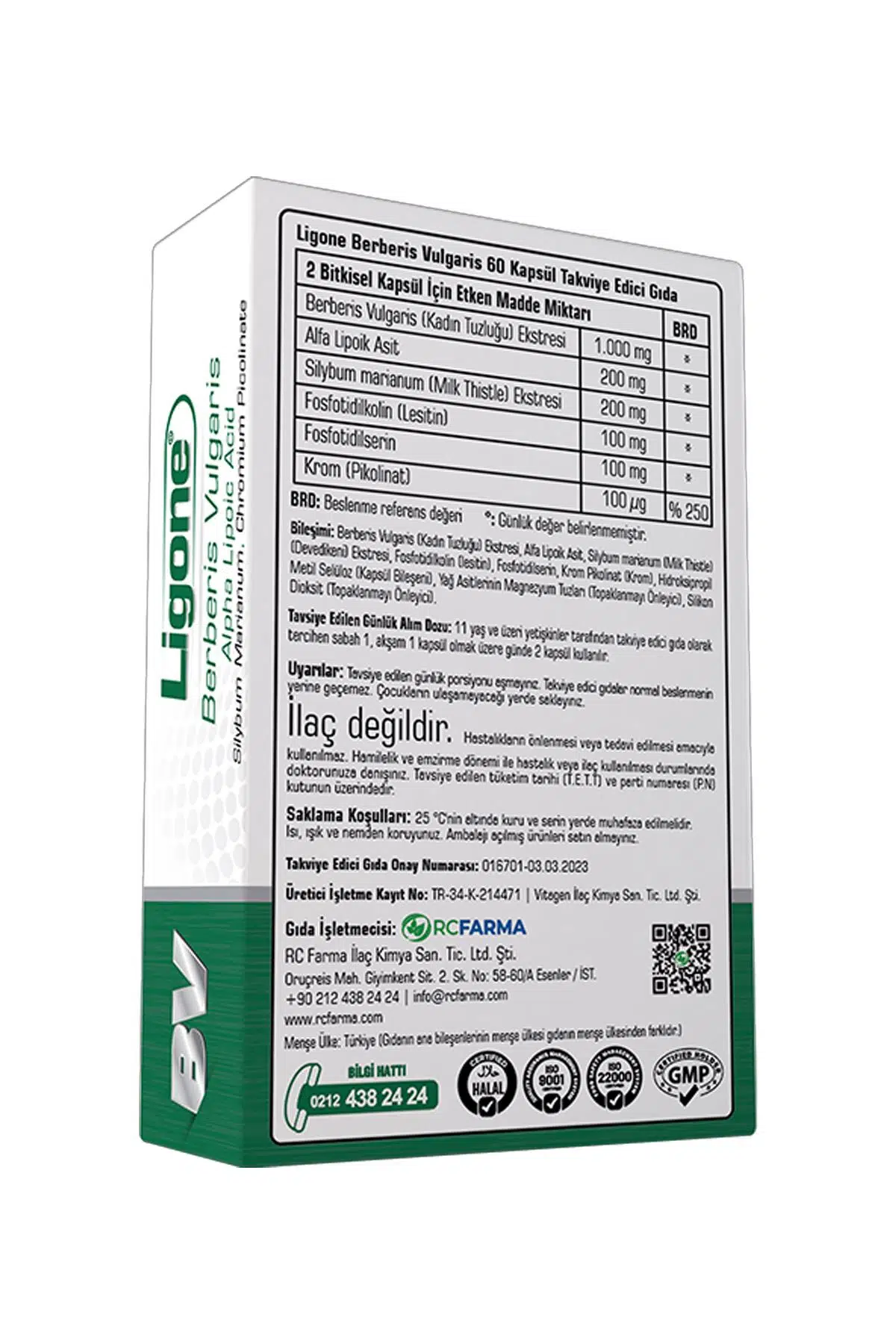 Ligone Berberis Complex kapsül, Berberis Vulgaris (Kadın Tuzluğu) Ekstresi, Alfa Lipoik Asit, Silybum marianum (Milk Thistle) Ekstresi, Fosfotidilkolin (Lesitin), Fosfotidilserin ve Krom (Pikolinat) içeriği ile yetişkinlerin kullanımına yönelik özel bir gıda takviyesidir.
